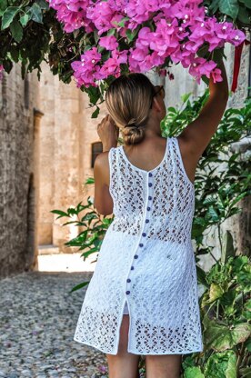 The Harna tunic is worked from the bottom up to the armhole in one piece in back- and forth rows. At armhole level, work is divided, and front and back are worked separately, then shoulders are joined using the three-needle bind-off method.