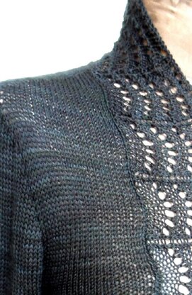 Harriett is a simple cardigan with a wide lace border that works well with a multicolored or self-colored yarn. The very light A-shape will suit most figures.