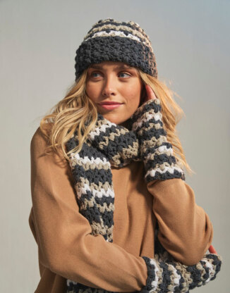 This simple crochet pattern is perfect for beginners, making a hat, scarf and fingerless gloves. Made on a larger than usual hook to create a lofty fabric that grows quickly. The pattern includes four colour combinations, all in Sirdar Loveful 100% Recycled Acrylic, spun from GRS-certified 100% recycled acrylic fibres. Choose one or your favorite colour combo to give your winter coat a fresh look or make them all to keep or gift.