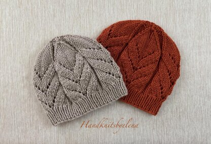 This hat is knitted in a very pretty lace stitch that looks like fern leaves. It's very easy and fast to knit! The pattern includes both written instructions and a chart for the stitch.