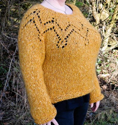 Havtorn (sweater/pullover/jumper) is chunky yet an elegant and fun design with a loose comfy form, knitted top down with a round yoke. The yoke is decorated with a lace pattern, cable stitch and an elongated stitch that adds a little flair to the design.