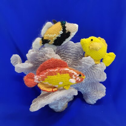 The fish were knitted on 2.25 mm dpn (UK 13, US 1). Together, they make a great mock aquarium or a colorful crib mobile. The reef fish measure approx. 11 cm.