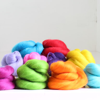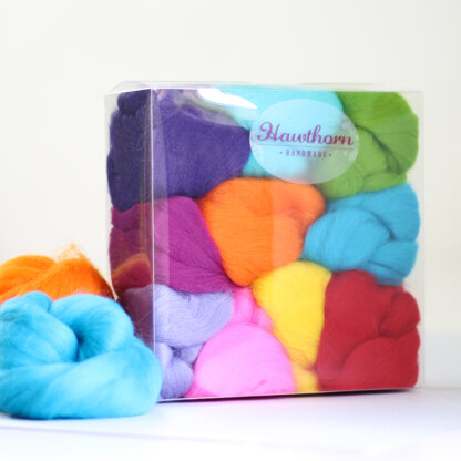 Spark your creative imagination with this felting wool bundle. The Brights bundle contains 10 vibrant shades of ethically sourced merino wool roving (approximately 100g in total).\n\n- Hawthorn Handmades wool bundles are the perfect partner to add colour to your felting projects and some woolly texture to your weaving.\n- Ideal if you've done a bit of needle felting or weaving but are now looking to create your own projects and flex your creative skills!\n- Each bundle comes in a clear box so you can easily find the colour you need and the box is made from 80% waste material and is fully recyclable.\n- All merino wool is ethically sourced from non-mulesed flocks in the Cape of South Africa.\n\nThe bundle contains approximately 10g each of:\n- Amethyst (purple)\n- Chartreuse (bright green)\n- Clementine (orange)\n- Flo Pink (neon pink)\n- Fuchsia (rich pink)\n- Hyacinth (rich purple)\nJonquil (bright yellow)\nScarlet (red)\nSpearmint (bright green/blue)\nTurquoise (bright blue)