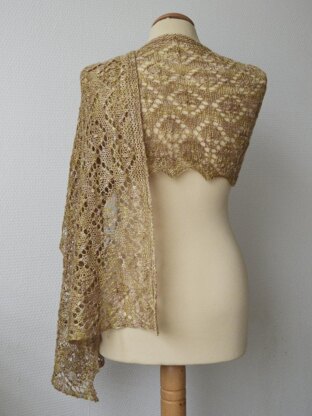 The Hazelnoot stole contains lace that is worked on the right side of the fabric only. Stitches used include knit, purl, p1 below, k2tog, skp, yo, a centered double decrease (sl2-k1-p2sso), the bunny ears yo stitch, and nupps.