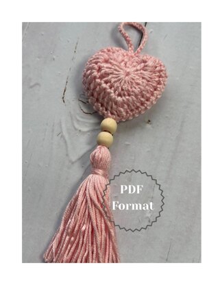 This is a handmade crochet ornament featuring a delicate heart motif at the top, paired with a natural wooden bead detail and finished with a soft tassel. Its neutral tones and rustic charm make it a perfect decorative piece for boho-inspired spaces or as a unique holiday decoration.