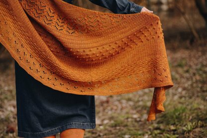 The shawl begins at the top center and is worked outwards to the border. There are two yarn-over increases in every row which create a long banana-like shape. The shawl is worked in sections, each featuring a different texture or lace stitch pattern.