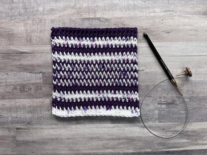 The Heartbeats Tunisian Square features a simple color change at the end of the forward pass and the tunisian half double stitch to create a look similar to an ultrasound picture. The texture of the tunisian half double stitch looks complicated because of the extra yarn over, and the return pass is a little different from the most common tunisian crochet stitches.