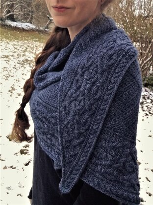 Hearthstone is an asymmetrical triangular shawl knit on the bias. It features a richly textured body and an intricate cable that runs along the bottom edge. The shawl begins with a provisional i-cord cast-on, from which extra stitches are picked up to form the shawl body.