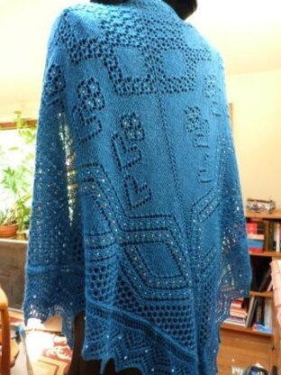 The pattern will take between 900 and 1200 yards of yarn depending on the size. Stitches used in this pattern are the usual lace stitches - yarn over, k2tog (and its counter part), & k3tog (and its counterparts). The first portions of the pattern are knitted with patterning done on the right side rows only (the wrong side row is a rest row). The bottom border however, is knit with patterning in all rows (no rest rows). The lace
