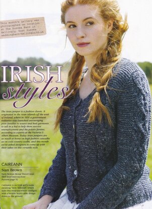 This is a pattern for a Heart Cable Cardigan, originally published in Knitting magazine under the name Caireann. issue 174. It is in garter stitch with a hearts cable in panels on the front, back and sleeves. Photo Laurel Guilfoyle for Knitting magazine.