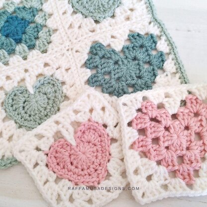 The pattern features: – a regular granny square; – a heart granny square; – and 2 “Heart in a Granny” squares.