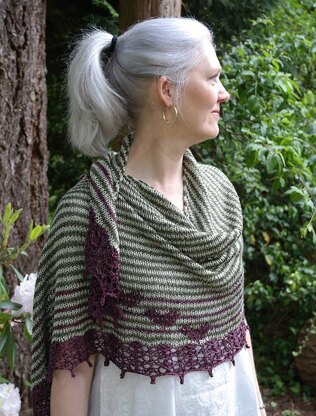 The perfect playground for combining color, Hearts on the Line is a classic crescent-shaped shawl, which features a body of 2-row stripes, finished with a lace border and picot bind off. Offered in two slightly different sizes and finishing styles and duplicate stitch hearts are added to the finished shawl to complete the look.