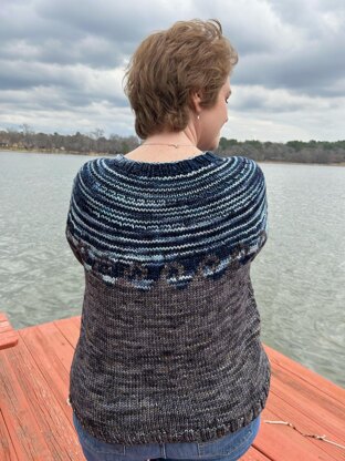 This top-down, colorwork pullover features two beautiful colorways that were custom-dyed for this design; together they look like stormy seas crashing on a rocky shore. This is a simple two-color chart which is easily knit by an absolute beginner to colorwork.