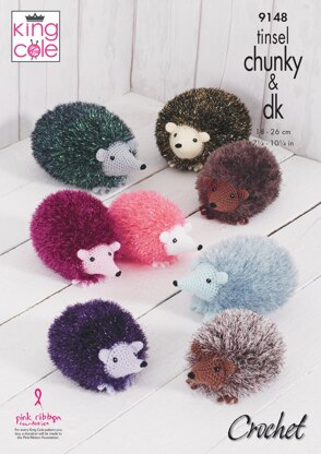 Hedgehog - Small, Medium & Large Crocheted in King Cole Tinsel Chunky and Dollymix DK - 9148 - Downloadable PDF is a Intermediate Crochet pattern by King Cole, available as a Downloadable PDF and includes instructions in English. Super fun to make, this pattern could be your next masterpiece!
