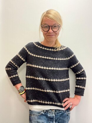 Heimathafen[ˈhaɪ ̯ matˌhaːfn ̩ ] (which translates to “home port”) is worked seamlessly from the top down. The beautiful allover “dip stitch colorwork”-stripe pattern highlights the round yoke construction and results in a classic but modern sailor pullover. Starting with the neck shaping, short rows are worked back and forth to create a higher back neck. The yoke is then worked in the round to sleeve separation. Increases are worked in the main color part of the yoke. The lower part of the yoke is shaped with raglan increases. Sleeve stitches are placed on hold to work the body top down. The 7/8 sleeves are worked top down in rounds to the cuffs.
