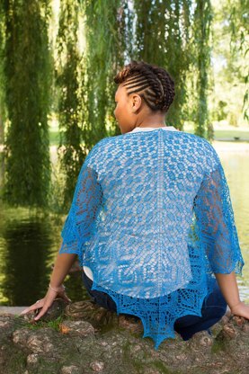 Shown in 100 % linen, the shawl blocks into a dramatic, crisp and flowing fabric.