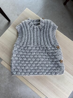 There is no shaping in the yoke. Instead, I have let the stitch pattern hug the baby’s body, resulting in relaxed comfort and a perfect fit. As the baby grows the rib will grow too, ending as a true waist-length tank top towards the end of its cycle.