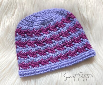 The Helping Hands Beanie is a crochet pattern that is sure to be a new favorite hat design. The intricute stitch combination is taught through photo tutorials as well as a video link in the pattern. Made in a solid color you see the texture in verticle patterns. But, if you switch colors every other row, the stitches seem to have their texture in a horizontal pattern. You may just want a few of these hats in your collection.