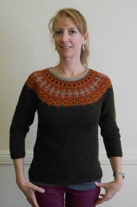 The body and sleeves are easy, you might say mindless!, knitting; the yoke has all the attributes of traditional Fair Isle knitting--only two colors per round, value gradients moving in the background and in the pattern, and geometric motifs with no long floats. Therefore, the sweater is a good introduction to stranded knitting.