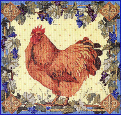 By Nancy Rossi. Our classic country French hen is lovely. She is fluffed up and proud to be standing in your home in all of her glory. The grapevine border is a perfect complement to the charm of this design. Fleur de lys symbols anchor each corner to make this an elegant and timeless design.\n