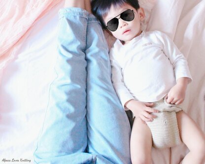 This one size adjustable diaper cover is knitted flat from the front waist to the back waist with a DK weight yarn and should use the hand wash wool in herringbone stitch. After finishing, install the snap buttons, then sew elastic bands on the crotch, front and the back waist. Fold all edges and weave in ends.