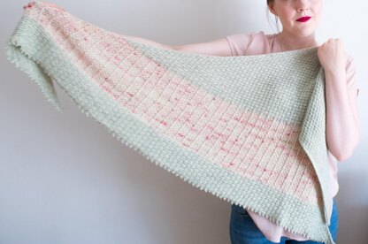 This deeply textured asymmetrical triangle Hessian shawl gets its name from the woven slipped stitch repeating pattern that makes up the main sections. It's one of my all time favourite stitches.