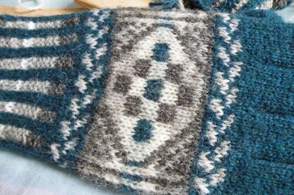 A traditional Fair Isle 'oxo' pattern made using Shetland wool. Five colours are used in the gloves where I use blues, greys and white and the details of these shades are within the pattern. I have charted these gloves with all of the colours. I have included a chart which is for use when you wish to devise your own colour scheme, you can see from the pictures that I have made fingerless gloves and also another pair using natural colours from Jamieson and Smith Supreme range of wool.