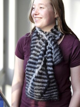Mohair is wonderfully light and warm, perfect for a toasty neck on cold winter days. Layers of mohair might turn out too warm, so I worked a keyhole scarf. It is striped with reversible cables, and both features together form a DNA pattern.