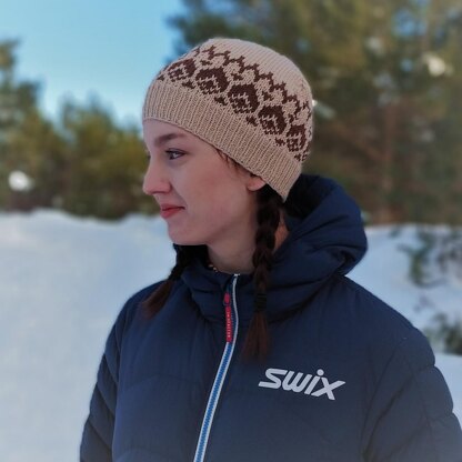To fit head circumference 53 - 56 - 59 - 62 cm Widt ca 24 - 25,5 - 27 - 29 cm Length beanie ca 21 - 21 - 22 - 22 cm Length earwarmer ca 11 cm Gauge: 22 st = 10 cm Needles: Circular needles 40 or 50 cm: 3 and 3,5 mm Double pointed needles: 3,5 mm or size needed to obtain correct gauge. Yarn: Sandnes Merinoull - 50 g = ca 105 m Yardage beanie: Main color (MC): 1 - 1 - 2 - 2 skeins. Contrasting color (CC): 1 skein in all sizes. Yardage earwarmer: MC: 1 skein in all sizes. CC: 1 skein in all sizes. If you are knitting both beanie and earwarmer, you will need 2 skeins of MC and 1 skein of CC in all sizes.