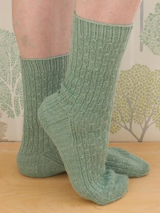 The socks are knitted from the top down using a standard heel flap and gusset construction. The foot length of the socks is adjustable to fit.