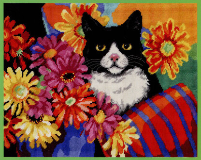 By Linda Gillum. Hiding in the Flowers is a classic design by Linda Gillum for Kooler Design Studio. The plush tuxedo cat peeks out at the viewer from behind bright gerbera daisies and colorful cushions. This is a great design for either the modern or retro home.