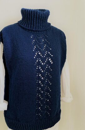 This pretty Aran Slipover will keep you warm without having the bulk of a long sleeve sweater. The generous collar and lace front panel make this a statement piece.
