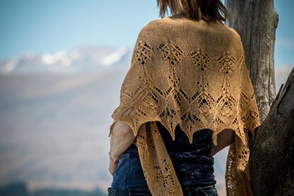 A dramatic crescent shaped shawl worked from the top down; lace and cable stitches create knitted motifs representing braided rivers and tussock flowing into the estuary where High Country river meets the Pacific Ocean.