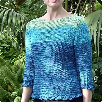 As cool as an off shore breeze and slightly shaped for a flattering fit, plus a hem of waves and a soft ripple pattern. Two strands of yarn are held together throughout. The five different colors change one at a time for subtle blends.