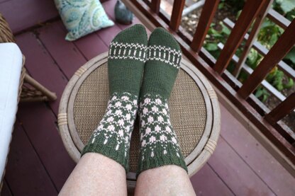 Hildegarden socks are worked with DK weight sock yarn from the top down with a short row heel. Stranded color work on the leg and near the toes reminds of summer days in the garden surrounded by pretty flowers.