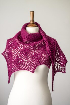 This shawl features a stockinette section and a lace edging with Estonian-style motifs; it can be easily customised to be larger or smaller.
