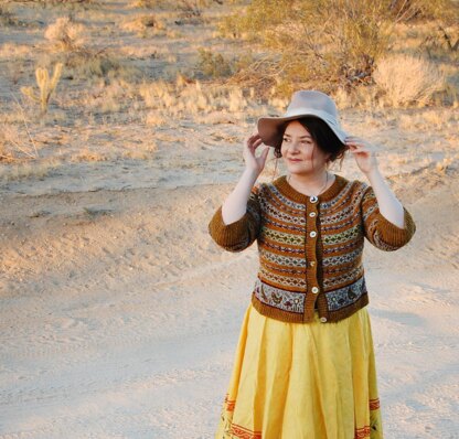 This is a pattern for a top down knit cardigan with 3.4 length sleeves. This pattern has a stranded circular yoke with Short Row shaping and a steek. The sleeve and bottom edge chickens are worked and then embroidery and Duplicate st is used to add colour and accents.