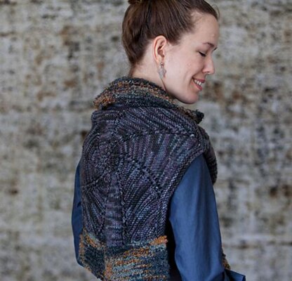 Knit a shrug as fascinating as you are! The back is an attention-grabbing Counterpane pattern, worked from the inside-out to create a hypnotic swirl. Raglan sleeves join with the Counterpane to create a garment that always looks polished, whether you wear it as a shrug for warmth or tied over your shoulders for a little extra coverage. Use the collar and trims to experiment with colors and textures for a shrug that's all you.