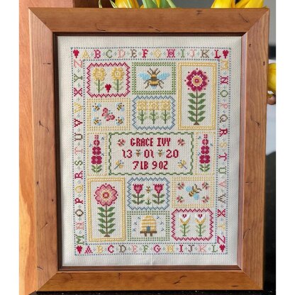 A beautiful Birth Sampler featuring bees and flowers and a lovely yellow and white bee hive. Stitched in a delicate palette of greens, blues and pinks. This will be a gorgeous keepsake for a new baby. The Sampler has a border containing the alphabet. There is space in the middle for a name, date of birth and weight.