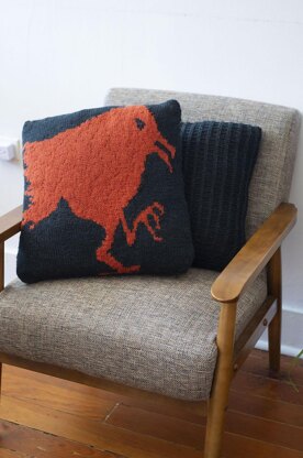 Two cushion covers inspired by two classic Hitchcock films: Dial M for Murder and The Birds. Knit intarsia style, the front of the pillows are knit with a chart, and the reverse of the pillows are knit in two different rectangular-type repeats for extra appeal so you can turn the pillows around depending on your mood. Seaming and adding a zipper at the bottom gives a professional looking finish.