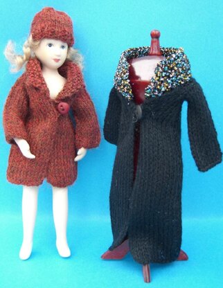 I have designed this easy to knit miniature knitting pattern for the dolls house in 1:12 scale. The finished outfit of coats and hat will fit a doll of about 6 inches tall in the dolls house.