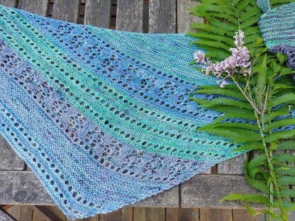 Pattern: Asymmetrical triangle shawl, using 6 mini skeins. Lace section is written and charted.