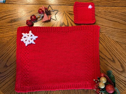 Pretty for any Christmas dinner table or party! If you make it without snowflakes, you can also use this set for Valentine’s Day, birthdays and other special Holidays! Snowflake is knit separately and sewn on.