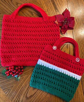 Great new, easy to knit shopping bags! Make in one color, 3 Holiday colors as we did, or use your favorite colors.