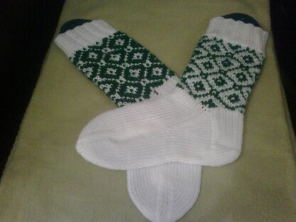 The design is written to allow you to make a sock to fit a foot circumference of either 8" or 8 1/2" and the foot length is adjustable. The yarn used is double knitting / sport weight yarn - gauge / tension is either 6 1/2 stitches or 6 stitches to the inch, measured over stocking stitch, depending on which size needle you choose. You will need 100g of main colour and 100g of contrast colour yarn to make a pair of socks. The leg pattern is written as a chart, and knowledge of colour work and stranding technique is required.