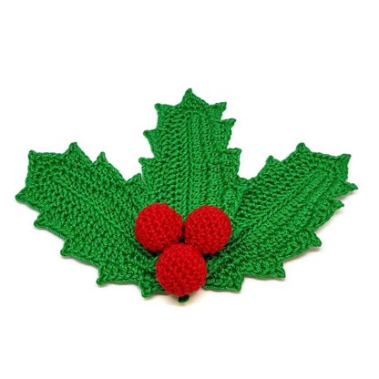 The pattern includes a step-by-step description of how to crochet 2 sizes of a holly leaf and a berry, including charts, photos and some video tutorials. PATTERN LANGUAGES: English (USA terminology).