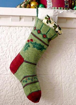 This festive stocking pattern cleverly uses both stranded colourwork and duplicate stitch to create cheerful holly motifs. Knit in a DK weight yarn, it is worked just like an oversized sock and is lined with felt for added sturdiness.