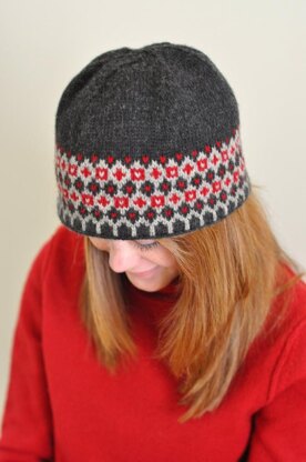 Holly Jean HatYarn Cascade 220 from Cascade Yarns Color A: Jet (4002), 2 skeins Color B: Gray (8401), 1 skein Color C: Red (9404), 1 skein