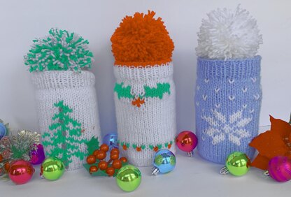 A great way to present a gift of home made sweet treats, small kitchen supplies, small bath items, home office supplies, and more! You can use up scrap yarns to knit the covers that fit over a one quart jar, then fill your jar with neat gift items! We like the small kitchen items, measuring spoons, potholder, dishcloth, and small mixing spoons. And the gift jar makes a nice gift of toiletries of small lotions and soaps, with a face cloth. For the Golfer, fill the gift jar with new golf balls! There are many ways to present a nice gift in these adorable gift jars! Use size 4 yarns, knitting needles, US # 8.