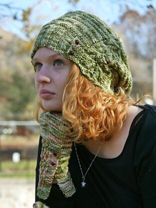 A warmly textured, asymmetrical hat in three sizes (S/M/L) that features an openwork panel in leaf motif with button closure to secure the brim. Choose a soft but springy yarn to ensure a well-fitted brim that supports the hat above; the welted fabric will collapse into a slight slouch to one side.